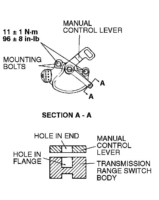 4. Loosen the transmission range switch body mounting bolts and turn the transmission range switch body so the hole in the end of the manual control lever and the hole (section A - A in the figure) in the flange of the transmission range switch body flange are aligned.