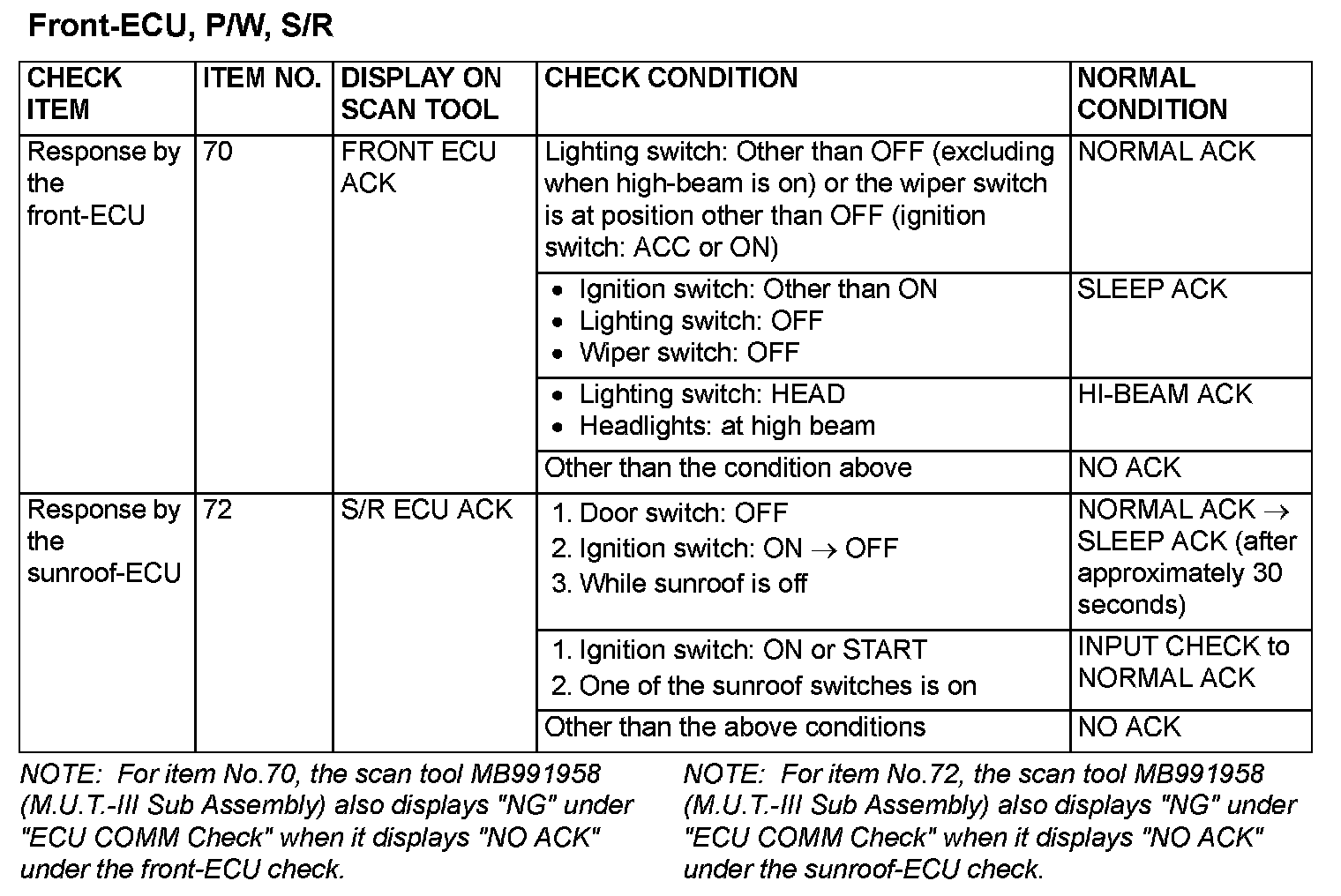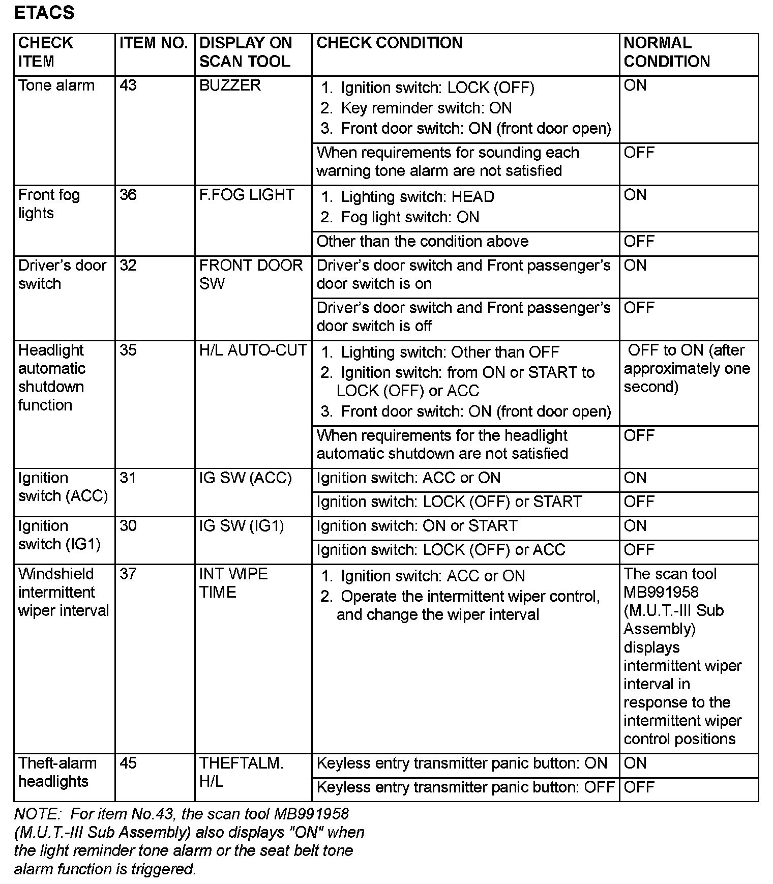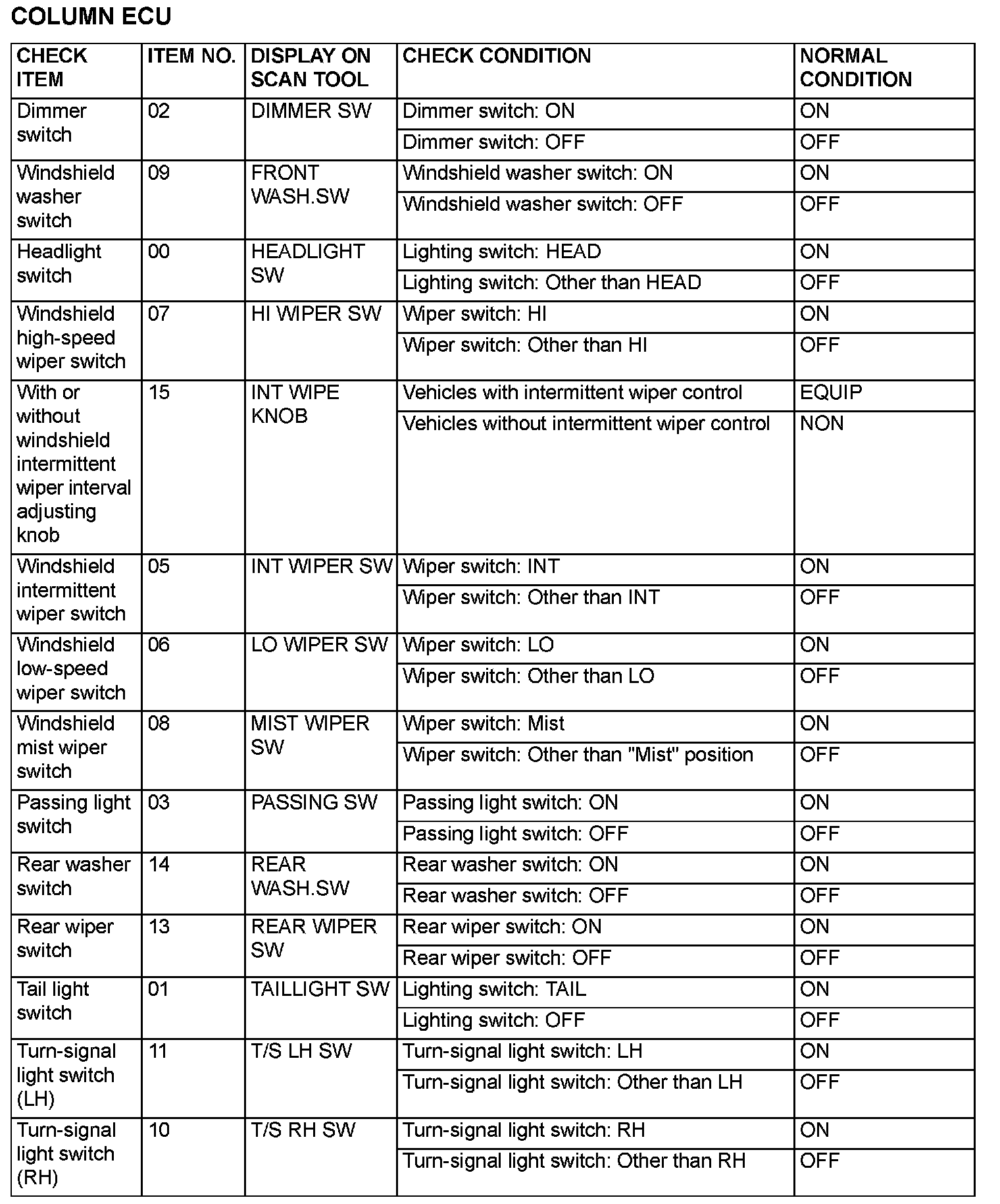 The table shows the service data and their normal condition, which are displayed during the "Data List."