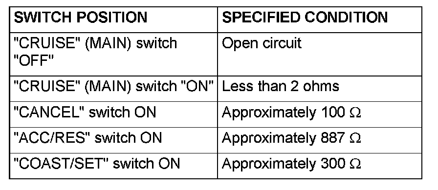 2. Measure the resistance between terminal 2 and terminal 3 when each of the "COAST/SET", "ACC/RES", "CANCEL" and "CRUISE" (MAIN) switches is pressed. If the values measured at the time correspond to those in the table, the resistance values are correct.