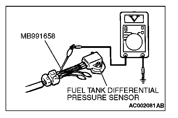 1. Disconnect the fuel tank differential pressure sensor connector and connect special tool MB991658 between the terminals of the disconnected connector.