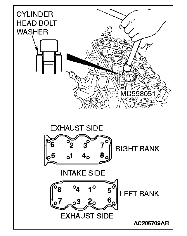 CAUTION: Install the head bolt washers with the beveled side facing upwards as shown in the illustration.