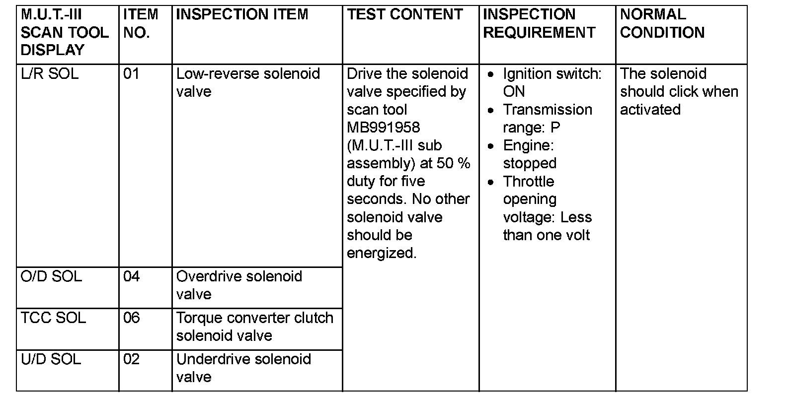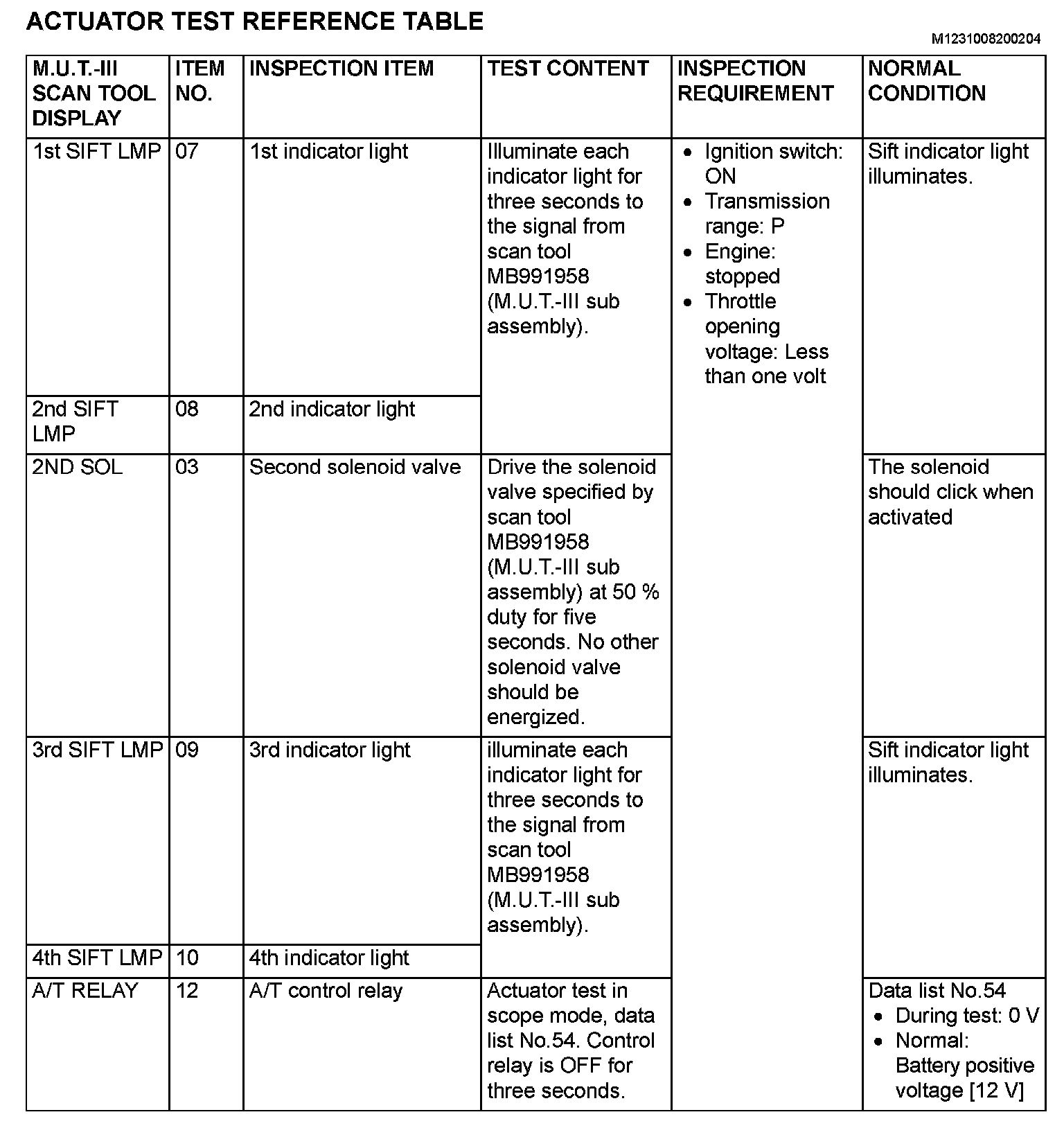 Actuator Test Reference Table