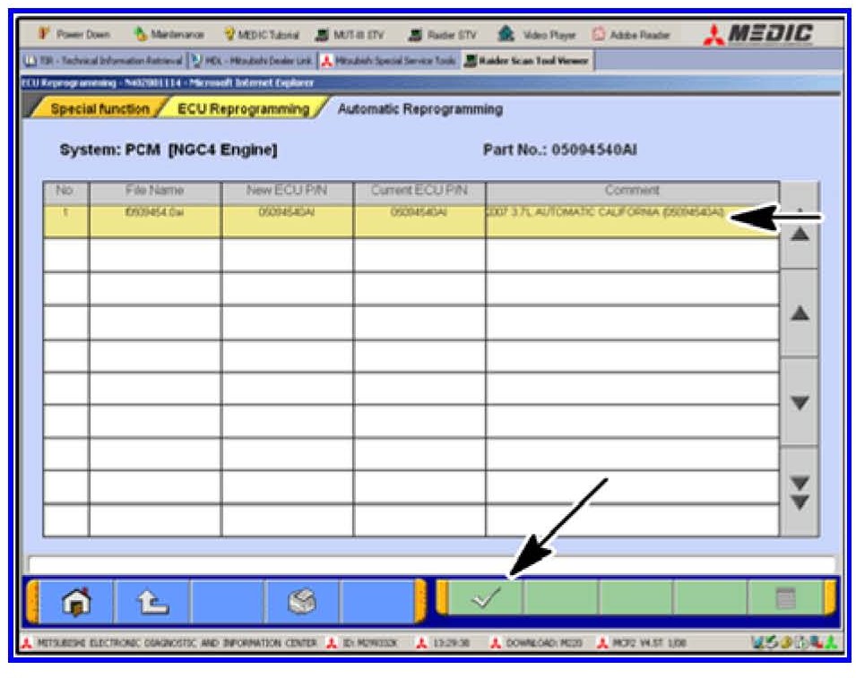 3. Refer to the Raider PCM (ECU) Software Part Number Chart shown in this bulletin or the "Raider ECU Part Number & ECU Calibration" chart on the Mitsubishi Dealer Link in the Service Tech Resources page to identify the appropriate calibration for this programming.