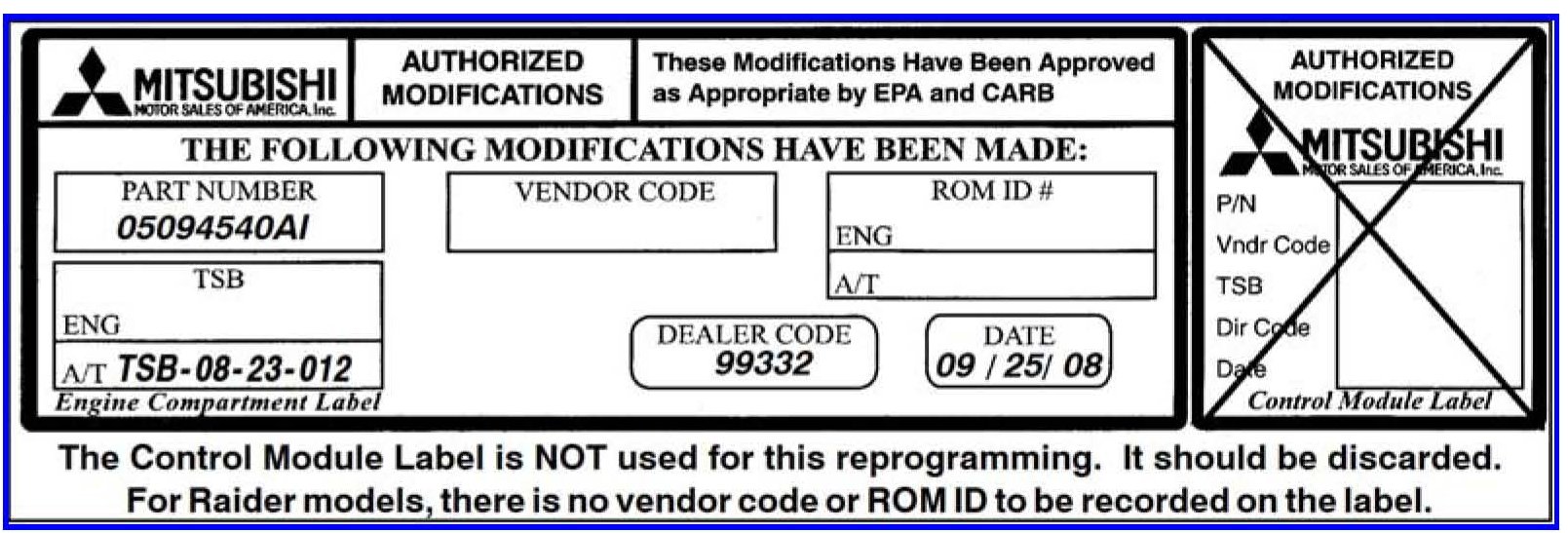 4. Using a ball-point pen, enter your dealer code, this TSB number (TSB-08-23-012) and the current date on the Engine Compartment / Control Module Label (part no. MSSF024G00).