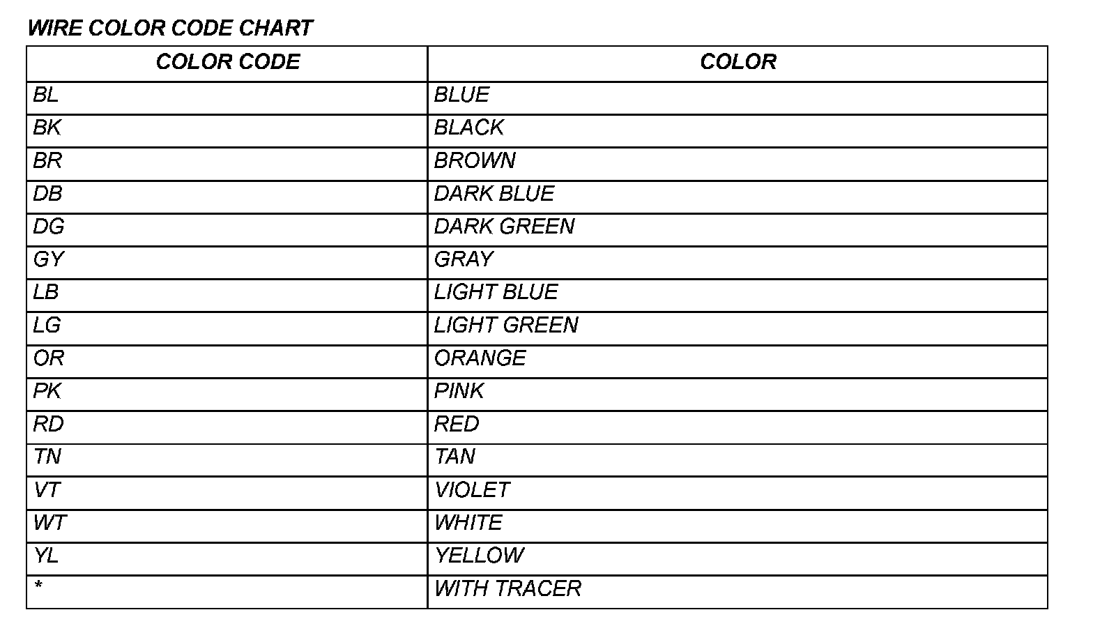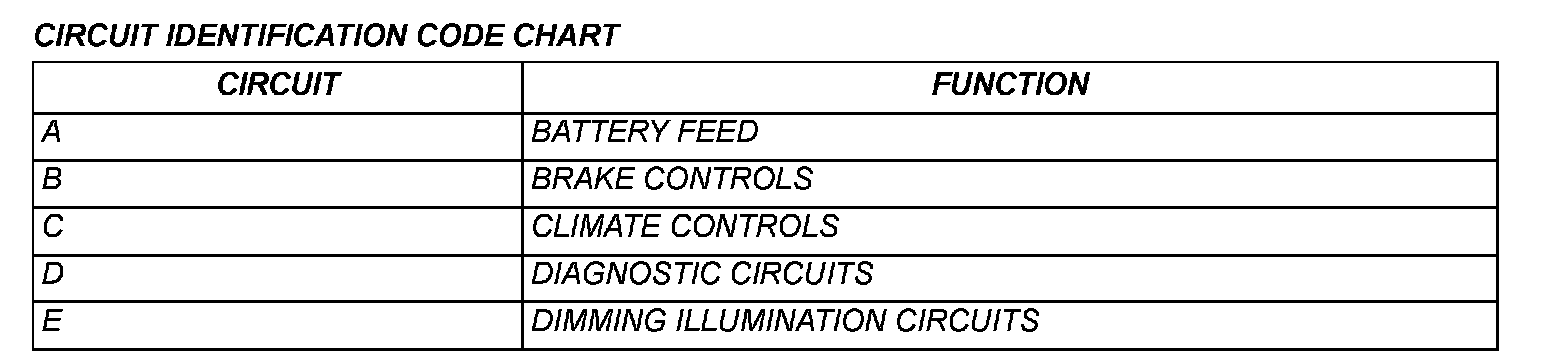 All circuits in the diagrams use an alpha/numeric code to identify the wire and it's function. To identify which circuit code applies to a system, refer to the Circuit Identification Code Chart. This chart shows the main circuits only and does not show the secondary codes that may apply to some models.