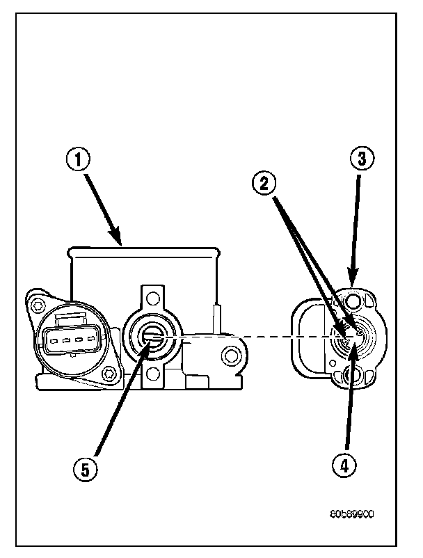 The throttle shaft end of throttle body (5) slides into a socket in TPS (4). The TPS must be installed so that it can be rotated a few degrees. If sensor will not rotate, install sensor with throttle shaft on other side of socket tangs. The TPS will be under slight tension when rotated.