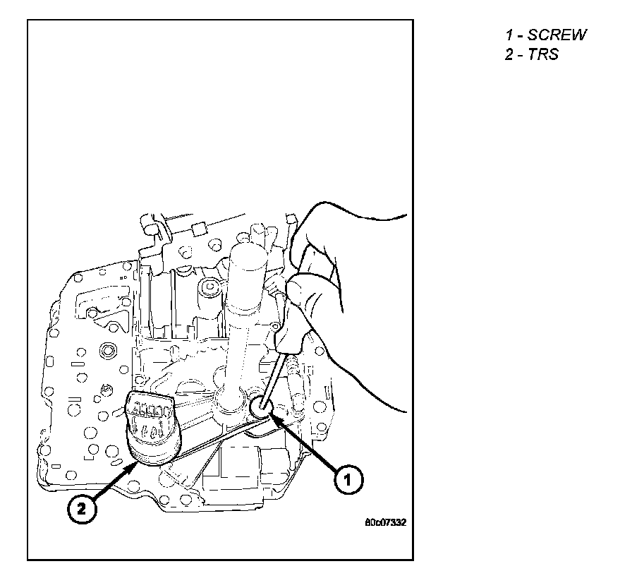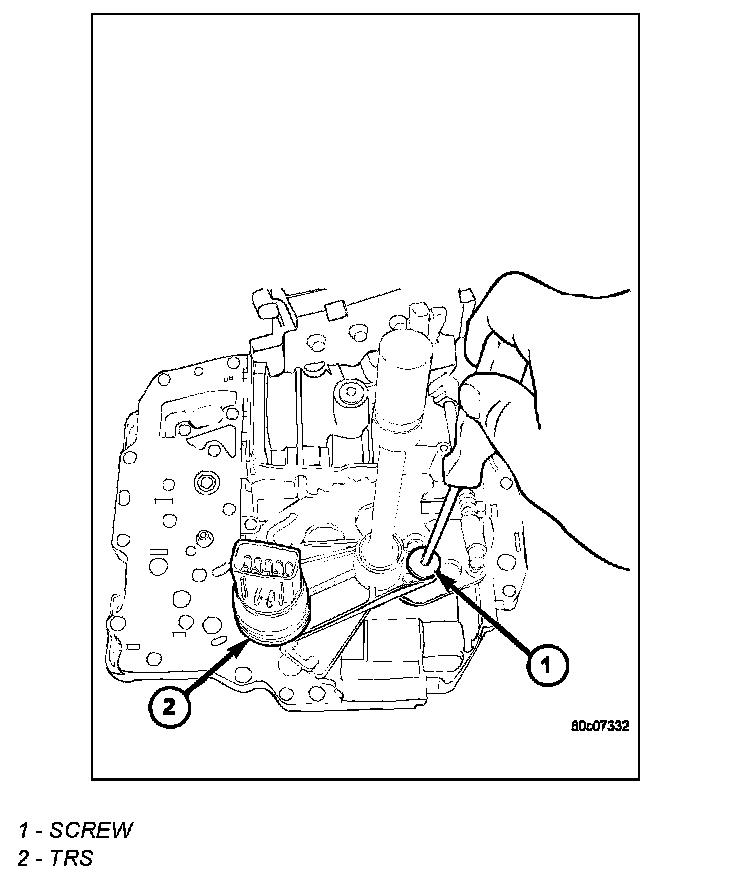 1. Install the TRS (2) to the manual shaft. Make sure TRS locating pin rests in manual valve bore slot.