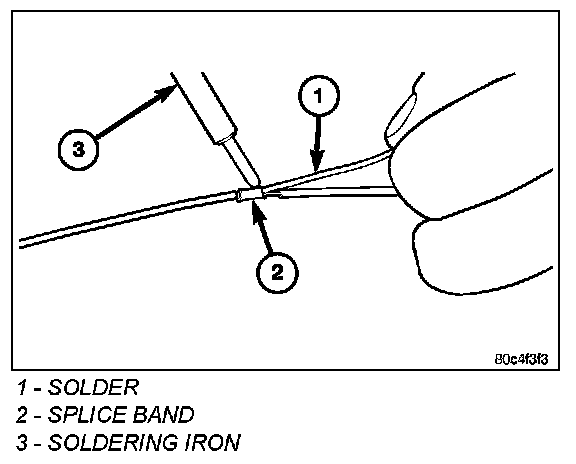 5. Solder (3) the connection (2) together using rosin core type solder (1) only.