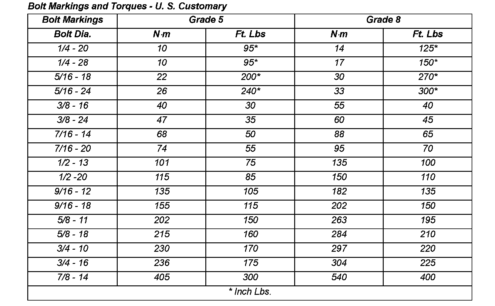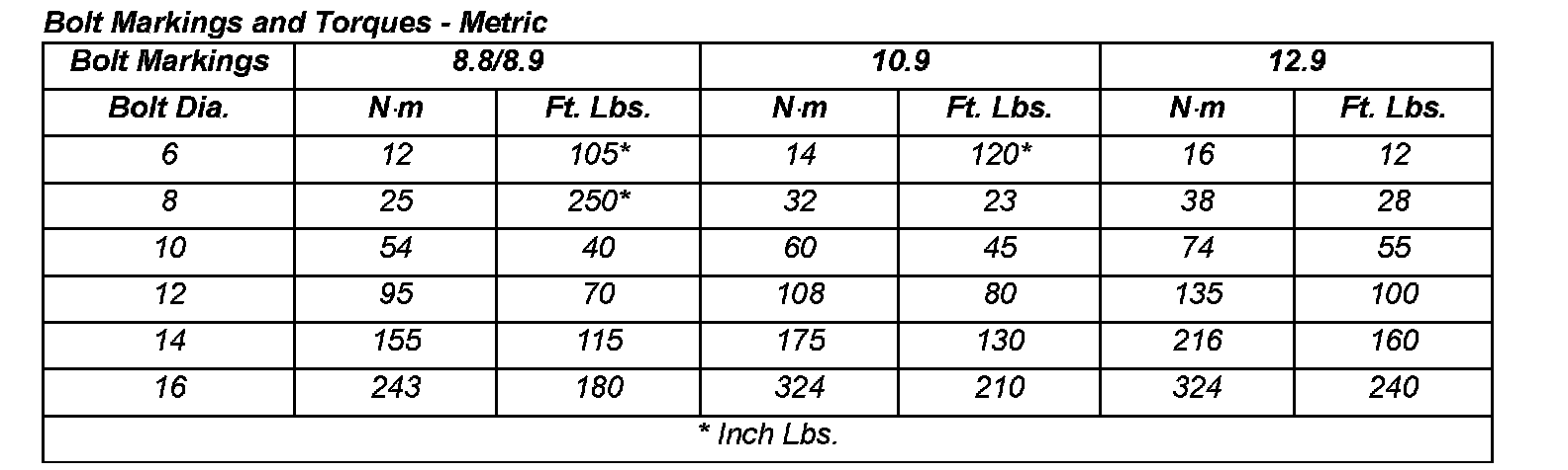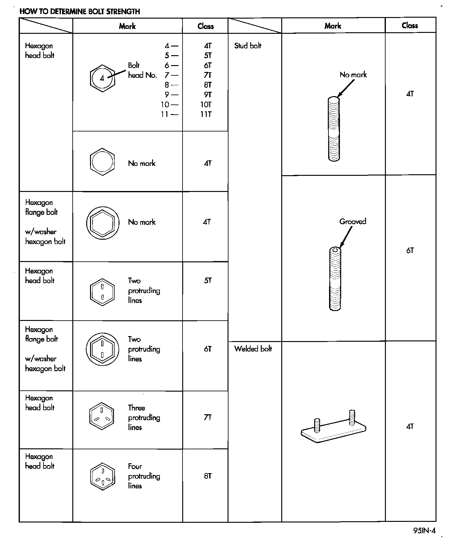 FASTENER IDENTIFICATIONThe SAE bolt strength grades range from grade 2 to grade 2 to 8. The higher the grade number, the greater the bolt strength. Identification is determined by the line marks on the top of each bolt head. The actual bolt strength grade corresponds to the number of line marks plus 2. The most commonly used metric bolt strength classes are 9.8 and 10.9. The metric strength class identification number is imprinted on the head of the bolt. The higher the class number, the greater the bolt strength. Some metric nuts are imprinted with a single-digit strength class on the nut face. Refer to the Fastener Identification and Fastener Strength Charts.