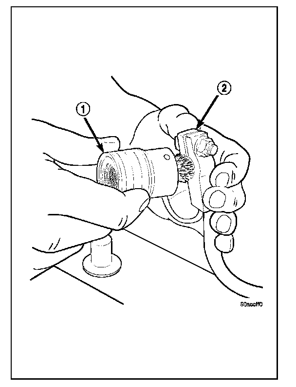 1. Clean the battery cable terminal clamps (2) of all corrosion. Remove any corrosion using a wire brush or a post and terminal cleaning tool (1), and a sodium bicarbonate (baking soda) and warm water cleaning solution.