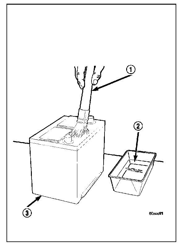 3. If the removed battery is to be reinstalled, clean the outside of the battery case (3) and the top cover with a sodium bicarbonate (baking soda) and warm water cleaning solution (2) using a stiff bristle parts cleaning brush (1) to remove any acid film. Rinse the battery with clean water. Ensure that the cleaning solution does not enter the battery cells through the vent holes. If the battery is being replaced, confirm that the replacement battery is the correct size and has the correct ratings for the vehicle.
