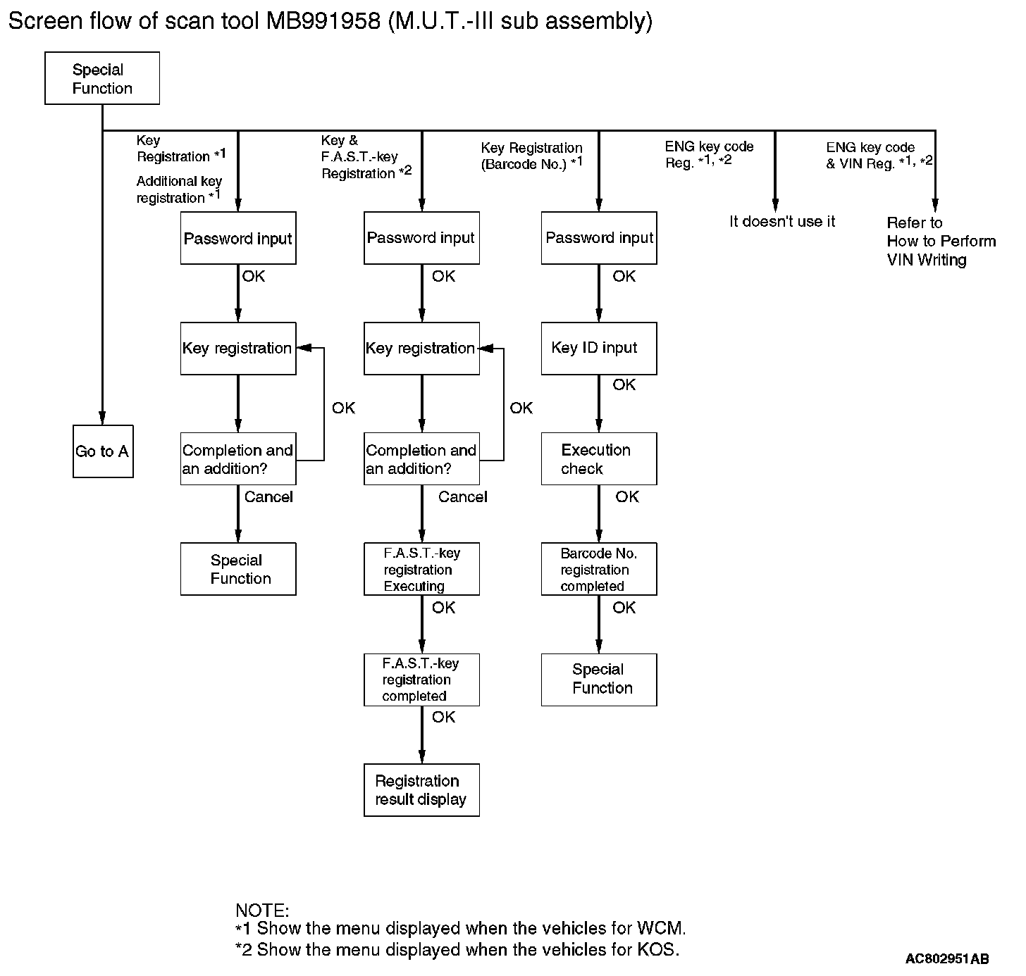The ID codes necessary for the engine immobilizer system, the keyless entry system and the TPMS can be registered using the scan tool MB991958 (M.U.T.-III sub assembly). WCM and keyless operation key are indicated as F.A.S.T and F.A.S.T.-key respectively in the scan tool MB991958 (M.U.T.-III sub assembly) screen.