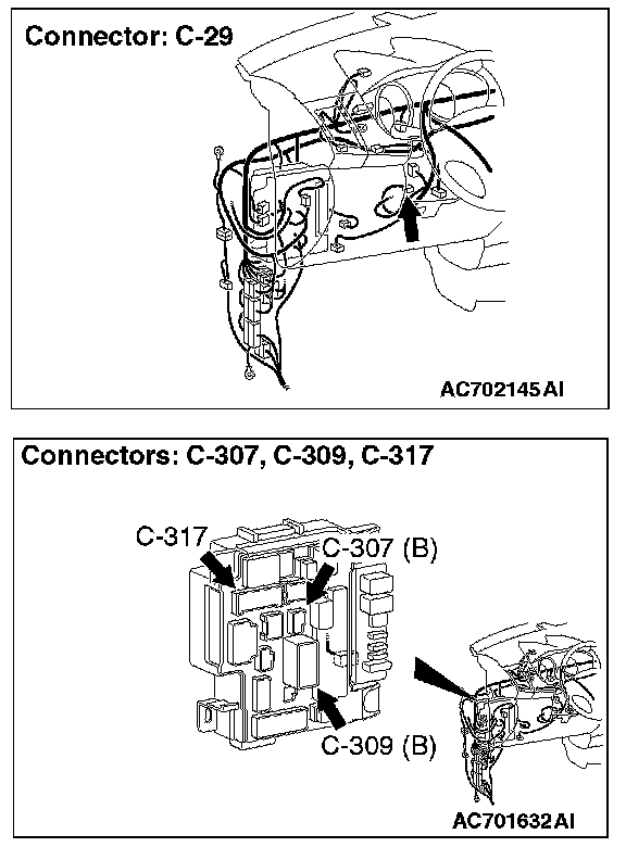 STEP 1. Check WCM connector C-29 and ETACS-ECU connector C-317 for loose, corroded or damaged terminals, or terminals pushed back in the connector.