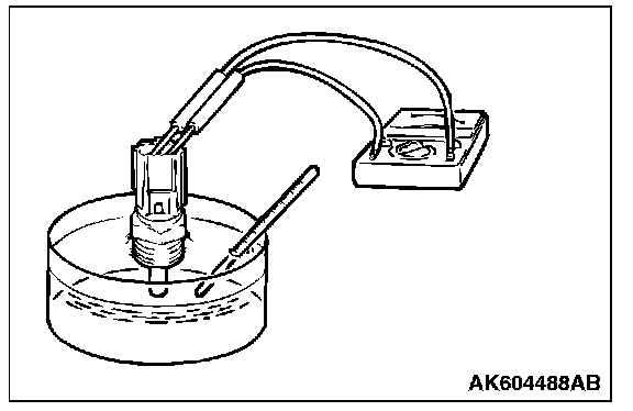 2. With the temperature sensing portion of engine coolant temperature sensor immersed in hot water, check the resistance.