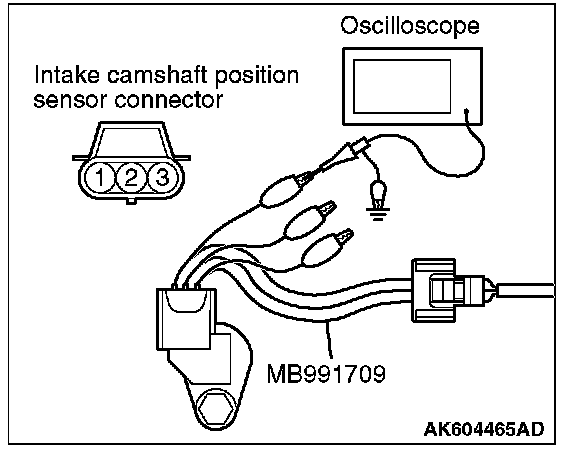 1. Disconnect the intake camshaft position sensor connector, and connect the test harness special tool (MB991709) between the separated connector (All terminals should be connected).