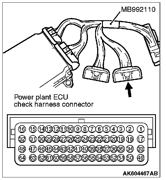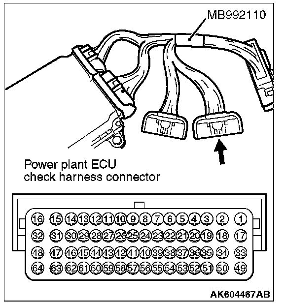 1. Disconnect all ECM connectors. Connect the check harness special tool (MB992110) between the separated connectors.