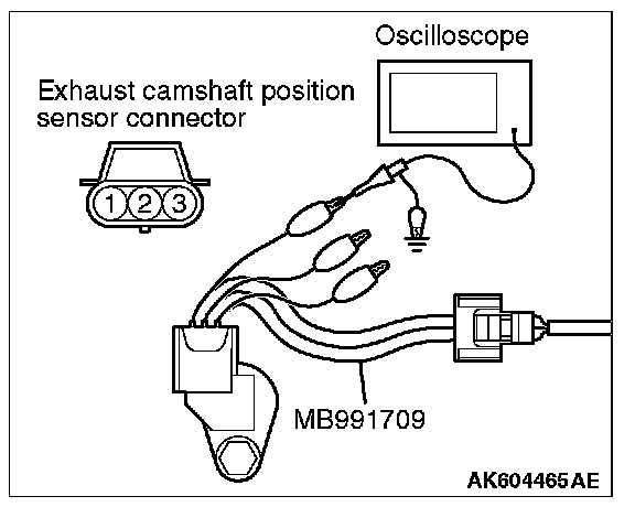 1. Disconnect the exhaust camshaft position sensor connector, and connect the test harness special tool (MB991709) between the separated connector (All terminals should be connected).