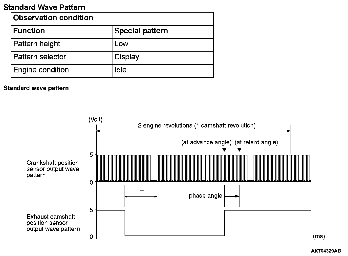 - Verify that, toward the engine speed of 2,500 r/min, time difference T from when the crankshaft position sensor output wave falls to when the exhaust camshaft position sensor output wave falls becomes less.