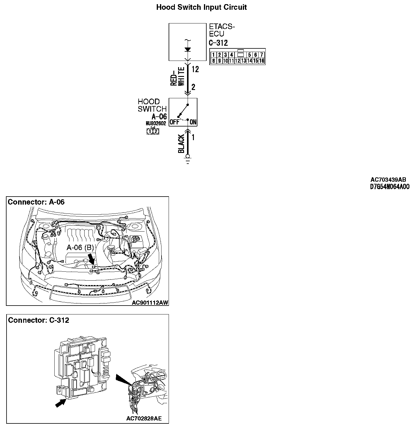 STEP 1. Check hood switch connector A-06 for loose, corroded or damaged terminals, or terminals pushed back in the connector.