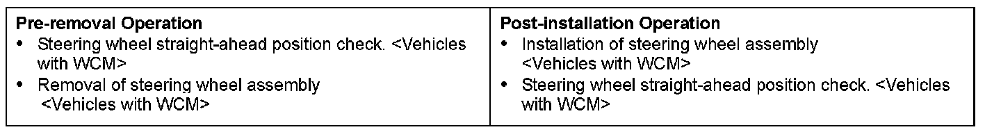 - Before removing the steering wheel assembly, refer to SRS - Service Precautions and Air Bag Module and Clock Spring [Vehicles with WCM].