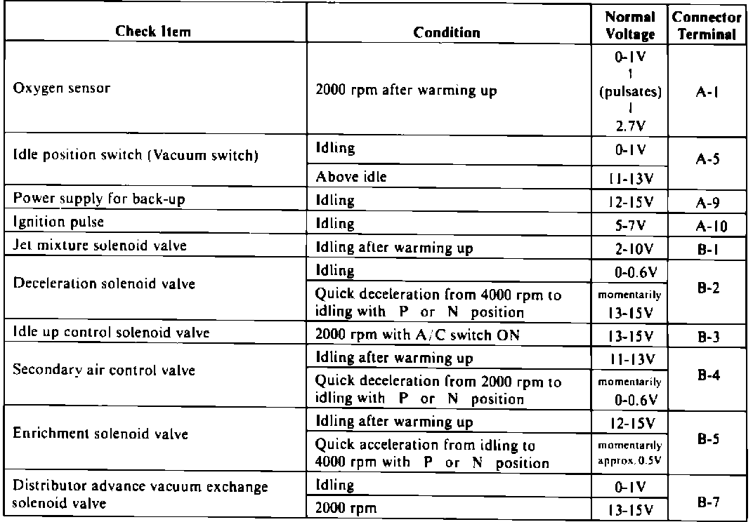 3. Refer to the 1984 FBC System Voltmeter Check Chart I (see page 3). Note the connector terminal callouts in the right column. Insert the positive probe into each connector terminal in turn. Switch the ignition from OFF to ON, and compare the voltage with that shown in the chart. For example, when the probe is on terminal A13, the voltmeter should read between 0.2 and 1.5V as shown in Figure 2 with the accelerator closed, and 4-5V when the accelerator is open.