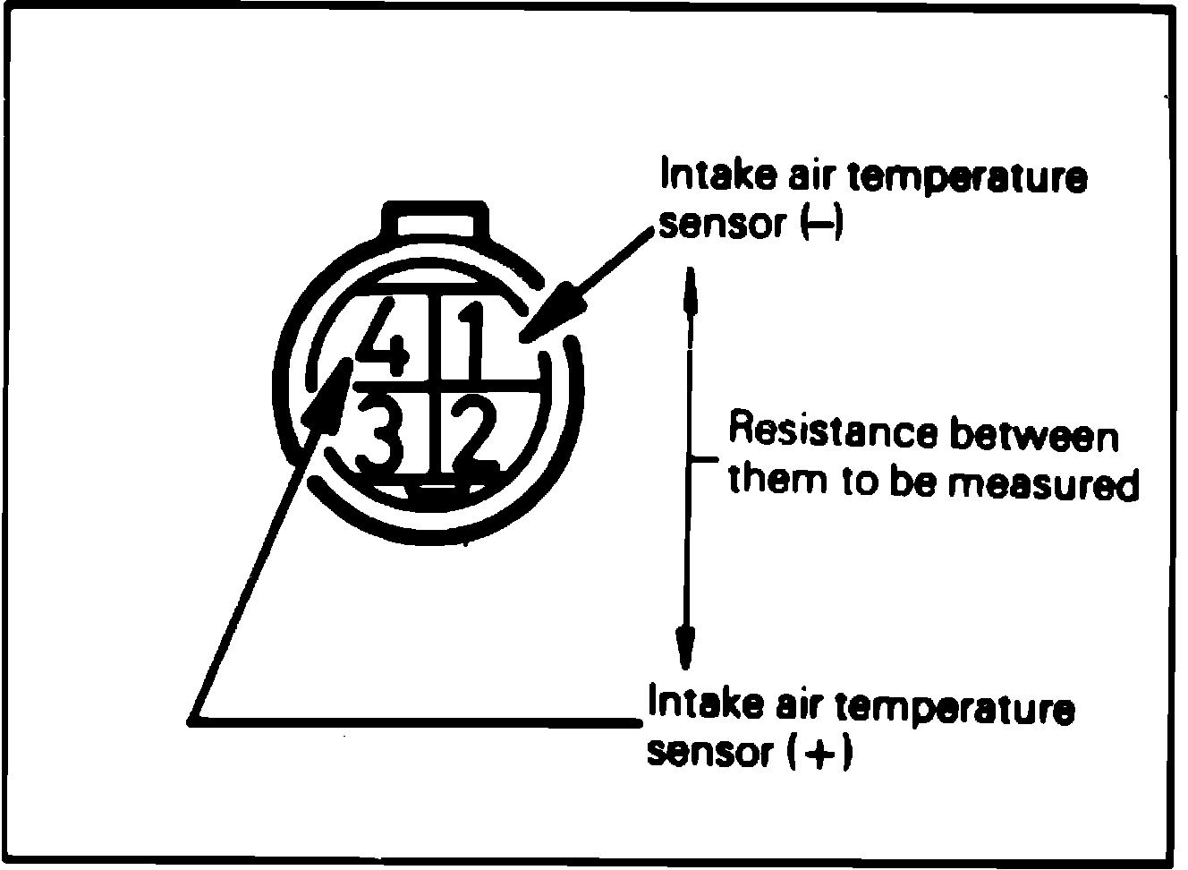 3. Check intake air temperature sensor by measuring resistance as shown, Fig. 43., resistance should be 2.65k ohms. Testing of air flow temperature sensor and intake air temperature sensor requires the use of special testing equipment.