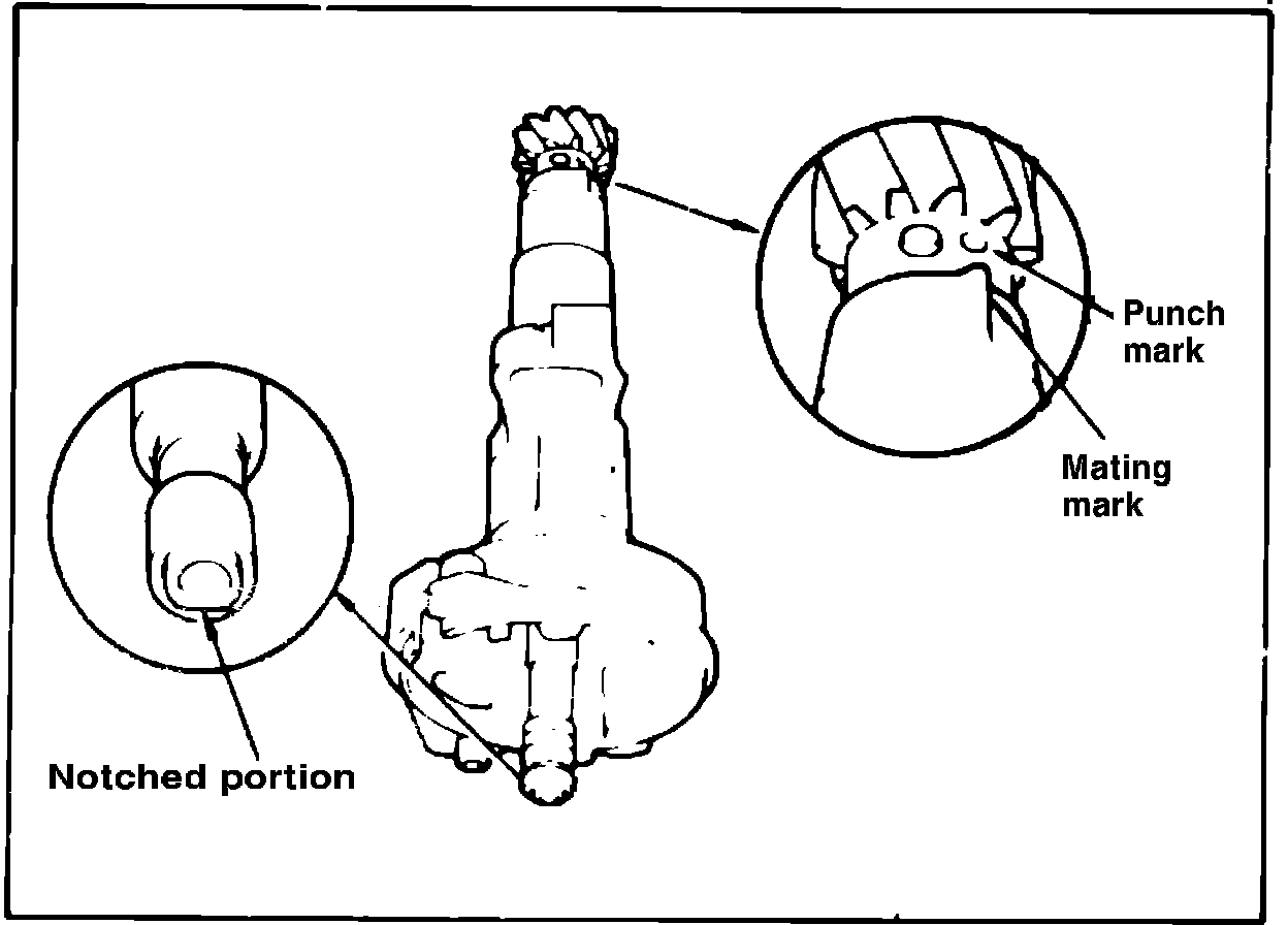 2. Install drive gear into distributor shaft at previously marked location. Then install a new roll pin. When a new drive gear is assembled onto the distributor shaft, ensure alignment punch mark on gear aligns with mating mark on housing. Check to ensure notched portion of shaft end is positioned as shown in Fig. 8.
