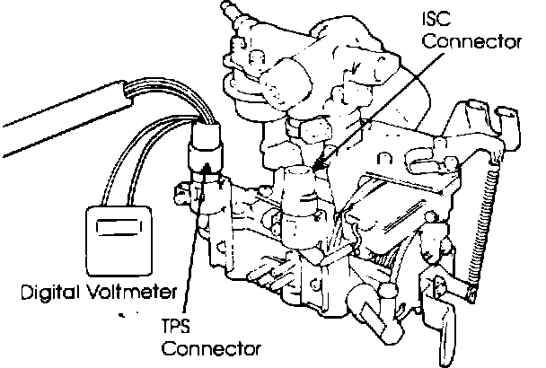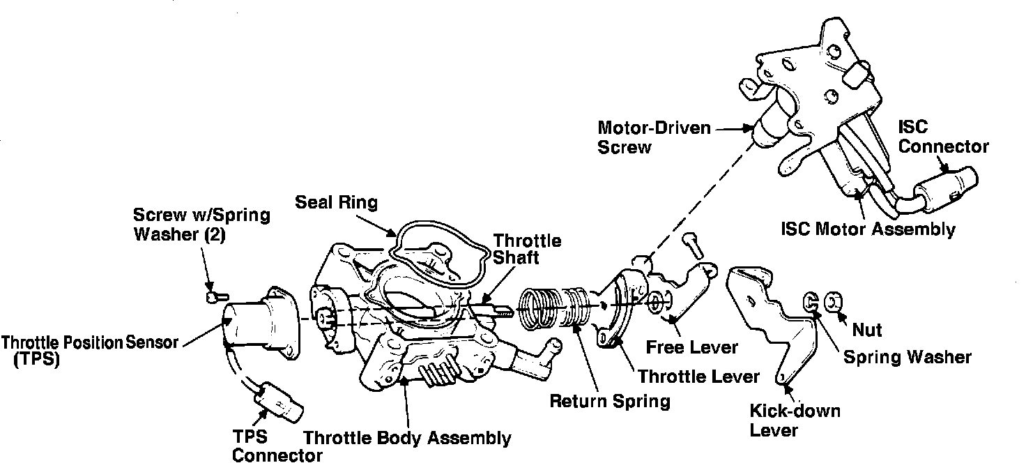 Since both the ISC and TPS are connected to the same shaft (See Figure 1), a change in the adjustment of one affects the adjustment of the other. Therefore, whenever the ISC servo motor is adjusted or removed and installed, the TPS must always be checked and adjusted. Also, since the voltage output of the TPS affects the engine performance and emissions, it is important that it be adjusted properly.