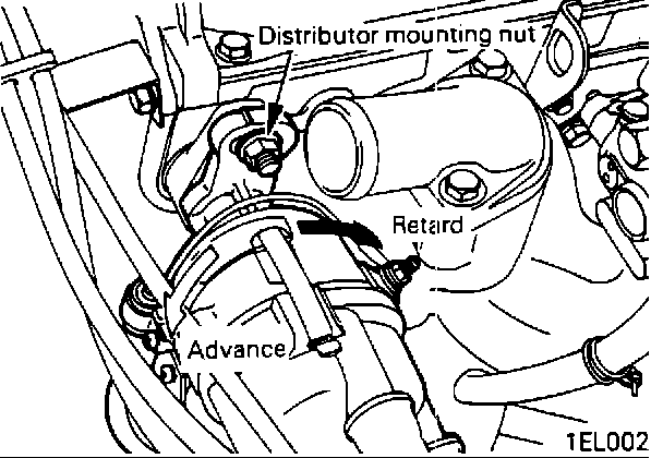 2. Loosen mount nut and turn distributor as shown to adjust timing.
