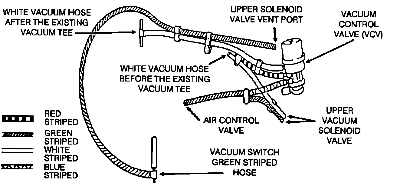 2. Figure 4 gives you a preview of the connection points of the hose assembly: the short green striped and the short white striped vacuum hose are connected to the upper vacuum solenoid valve; the remaining end of the short green hose goes to the Air Control Valve; The shorter white striped hose connects to the white striped vacuum hose before the vacuum "TEE"; the longer white striped hose "TEES" into the white vacuum hose after the existing vacuum tee; the long green striped hose connects the upper solenoid valve vent port to the vacuum switch green striped hose.