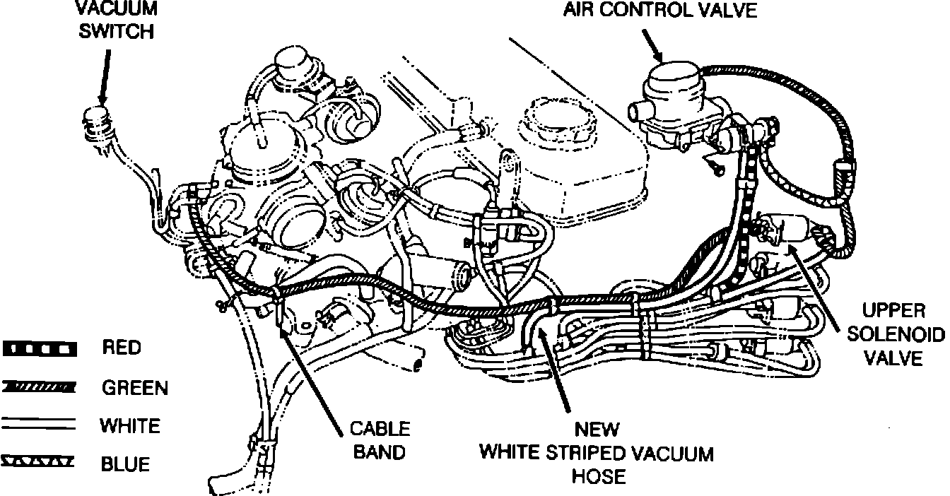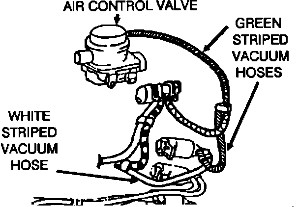 [ ] Short green striped vacuum hose connected to the Air Control Valve and the Inboard nipple of the upper solenoid valve.