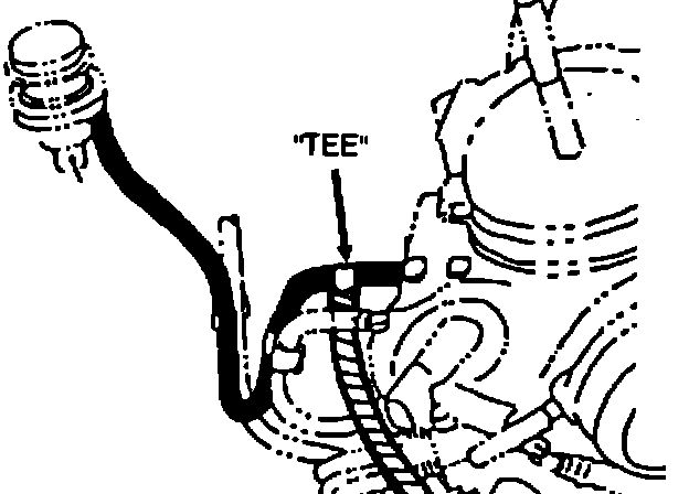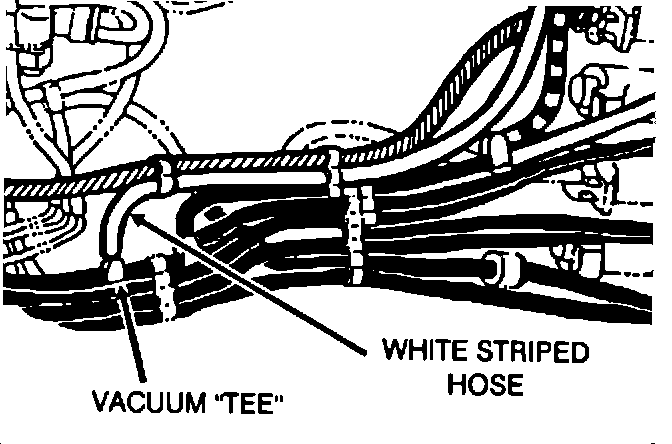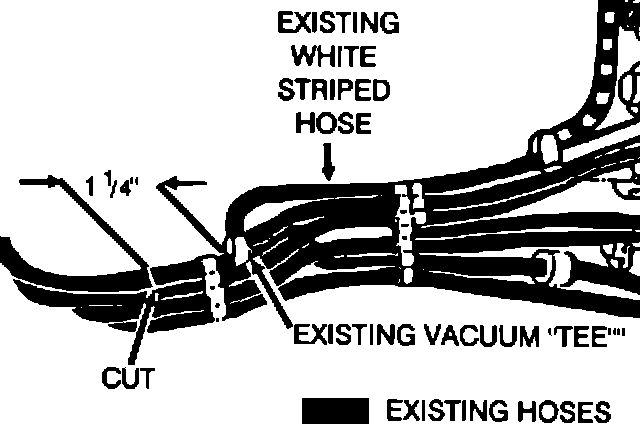 8. You will be making another cut in the existing white striped vacuum hose. Locate the existing vacuum "TEE". As shown in Figure 10, cut the existing white striped vacuum hose about 1-1/4" from the existing vacuum "TEE".