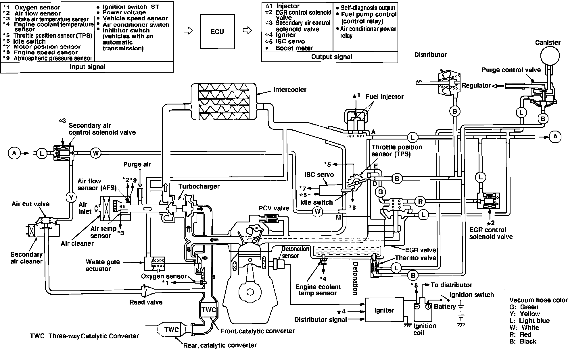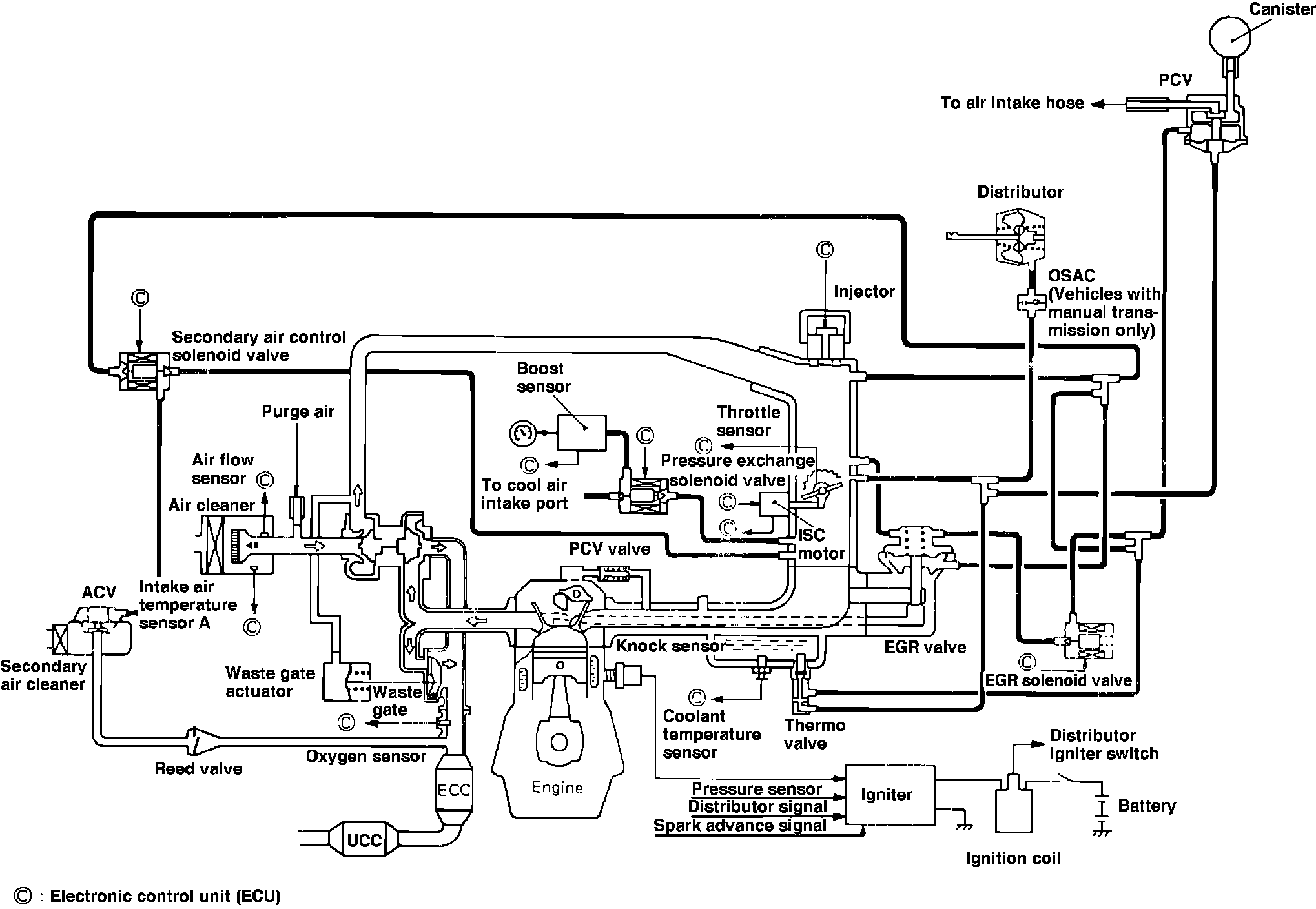 The Electronically Controlled Injection System (ECI), Figs. 6 through 9, used on the 1987 - 88 turbocharged engines, is a computer controlled, dual point fuel injection system which provides a precise fuel/air ratio under all driving conditions. The system utilizes a pre-programmed electronic control unit (ECU), to regulate ignition timing, idle speed, emission devices and fuel/air ratio. Various sensors and switches located throughout the engine compartment provide information to the ECU. This system also incorporates a self diagnosis function which monitors various parameters for proper operation.