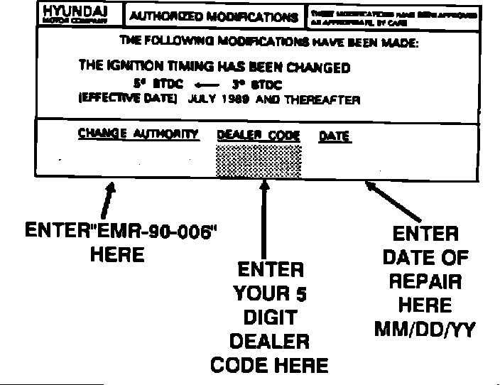 36. Apply the authorized modification label to the underside of the hood, close to the emissions label. This label will show the new ignition timing specification. Thoroughly clean the hood surface before applying the new label.