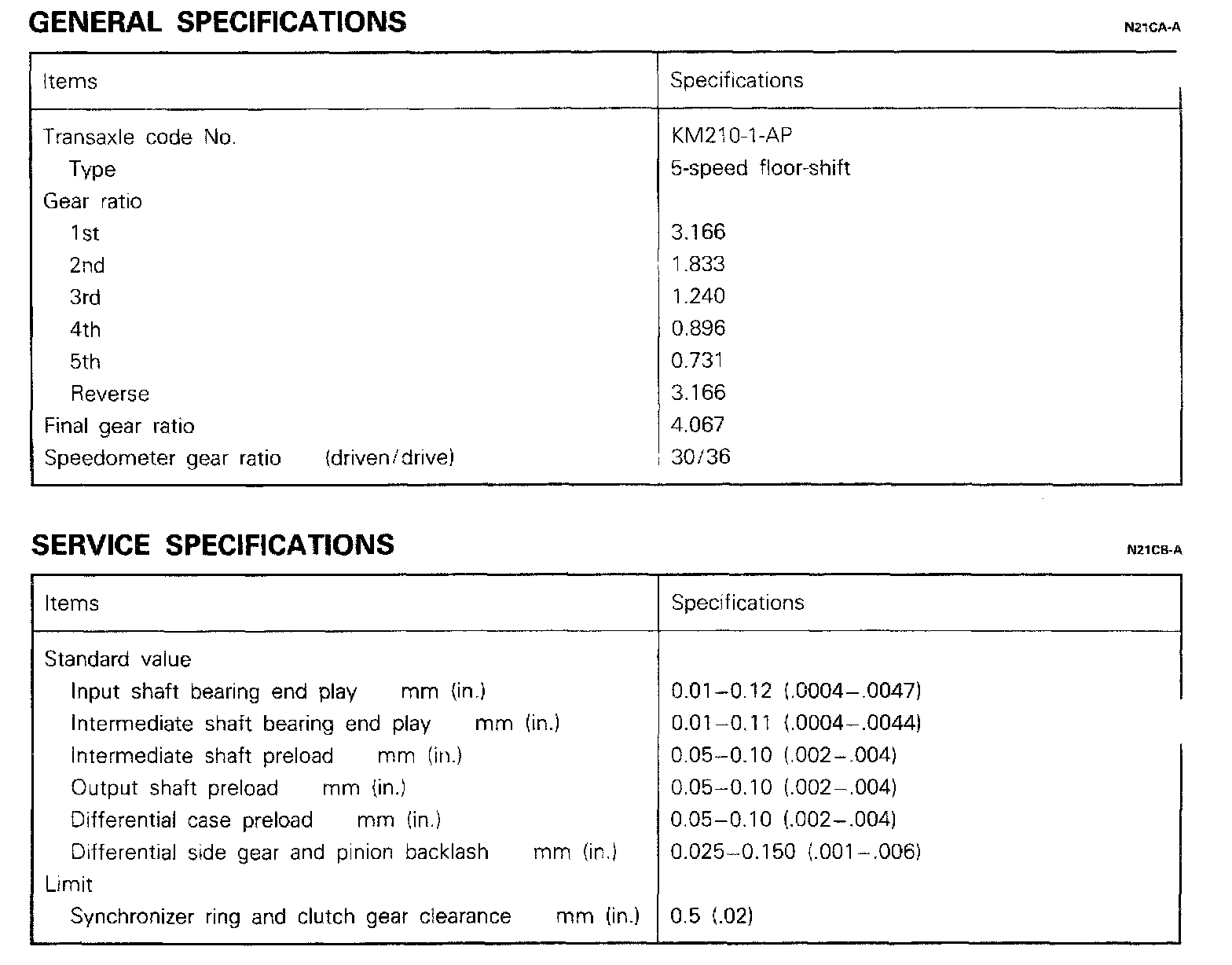 KM210-1 5-spd M/T, Gear Ratios & Standard Values & Limits: