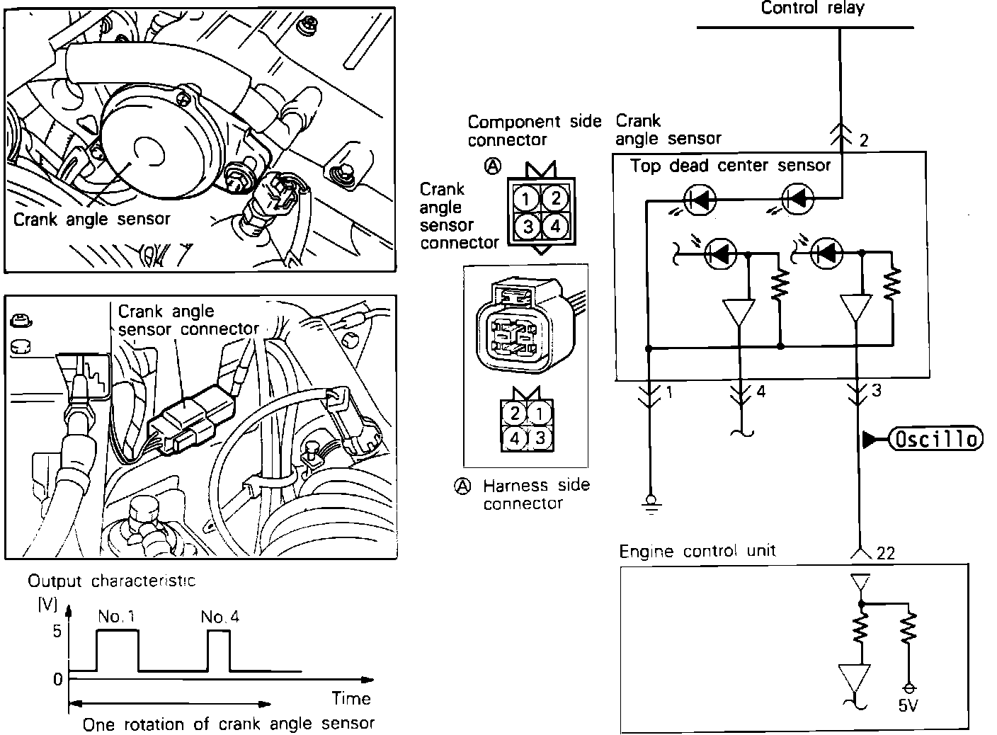 1. Connect test leads from the oscilloscope to the #3 terminal of the sensor connector and run the engine at idle speed.