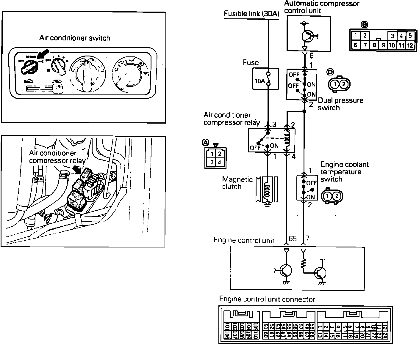 To test the Air Conditioning Signal to the ECU, disconnect the ECU connector and locate pins 7 and 65 on the ECU connector and test for the presence of power with the A/C switch in the "on" position and the ignition on. System voltage should be available with the switch in the "on" position and 0 volts should be present in the "off" position. If there is no power at the ECU, the air conditioning circuits should be checked. Refer to HEATING, VENTILATION AND AIR CONDITIONING.