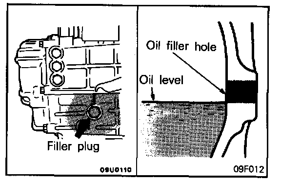 (3) Refill the transaxle to the proper level with specified transaxle oil. The oil level should be the bottom of the oil filler hole.