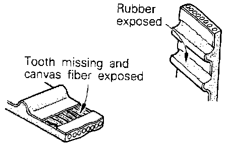 Canvas on load side tooth flank worn down and rubber exposed (tooth width reduced).