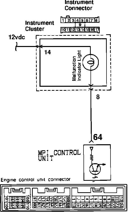 To test the malfunction indicator light, located in the instrument cluster, turn the ignition switch on. The light should illuminate. This insures that the light is operative. If the light bulb does not illuminate the most likely fault is a defective light bulb. If the light tests good the other possible causes are, the ECU not supplying ground at terminal 64, the wiring harness, or the instrument cluster printed circuit board (refer to ELECTRICAL AND ELECTRONIC DIAGRAMS).