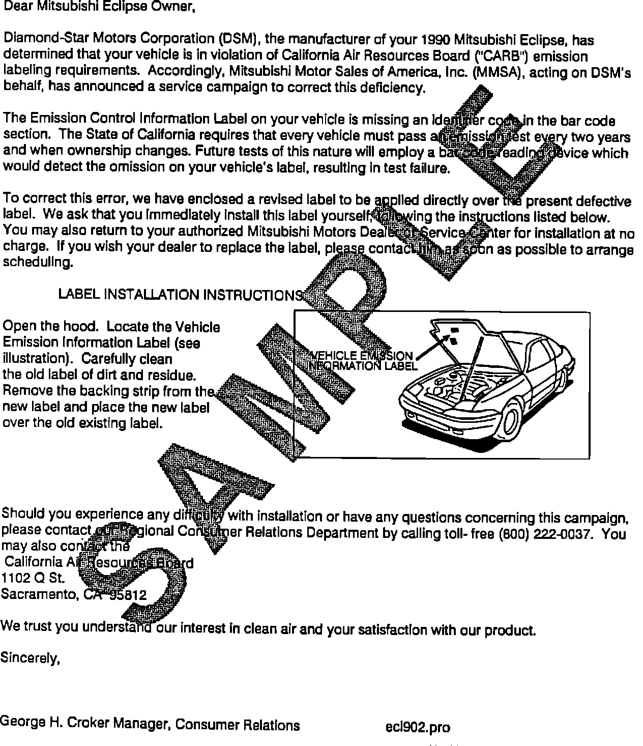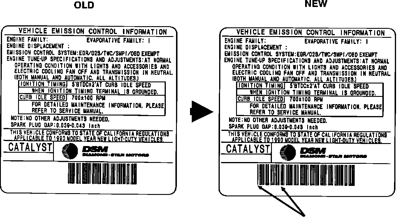The Vehicle Emission Control Information Label on some 1990 California Eclipse vehicles must be replaced. A letter has been sent to the affected vehicle owners instructing them to install the Vehicle Emission Control Information Label themselves. A copy of the customer notification lefter appears on page 3. Any vehicle owner who does not want to install the new label personally can ask their Mitsubishi dealer to install the label.