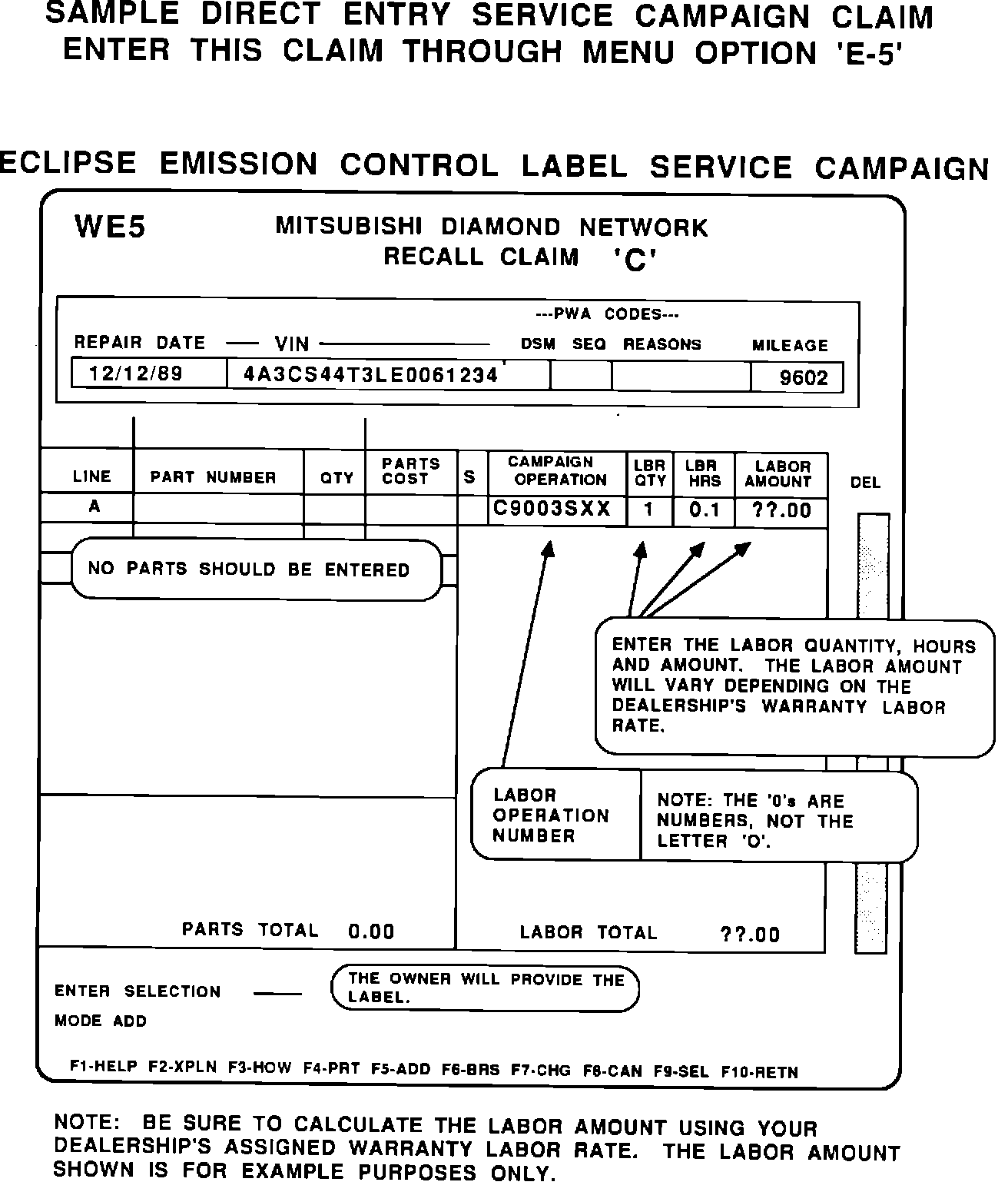 Reimbursement for performing the label installation may be claimed by submitting a RECALL CLAIM (Claim type "C") through the Diamond Network Warranty System menu option "E-5" as shown. DO NOT SUBMIT AS "W" CLAIM.