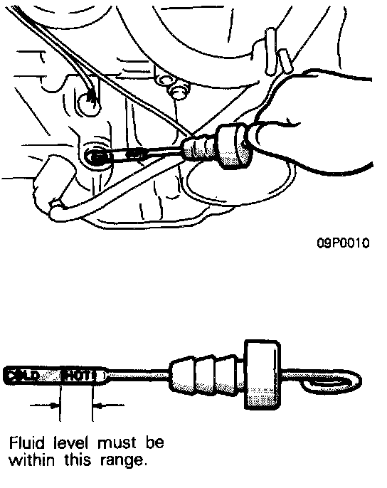 5. Check to see if fluid level is in "HOT" range on dipstick. If fluid level is low, add automatic transaxle fluid until level reaches "HOT" range.