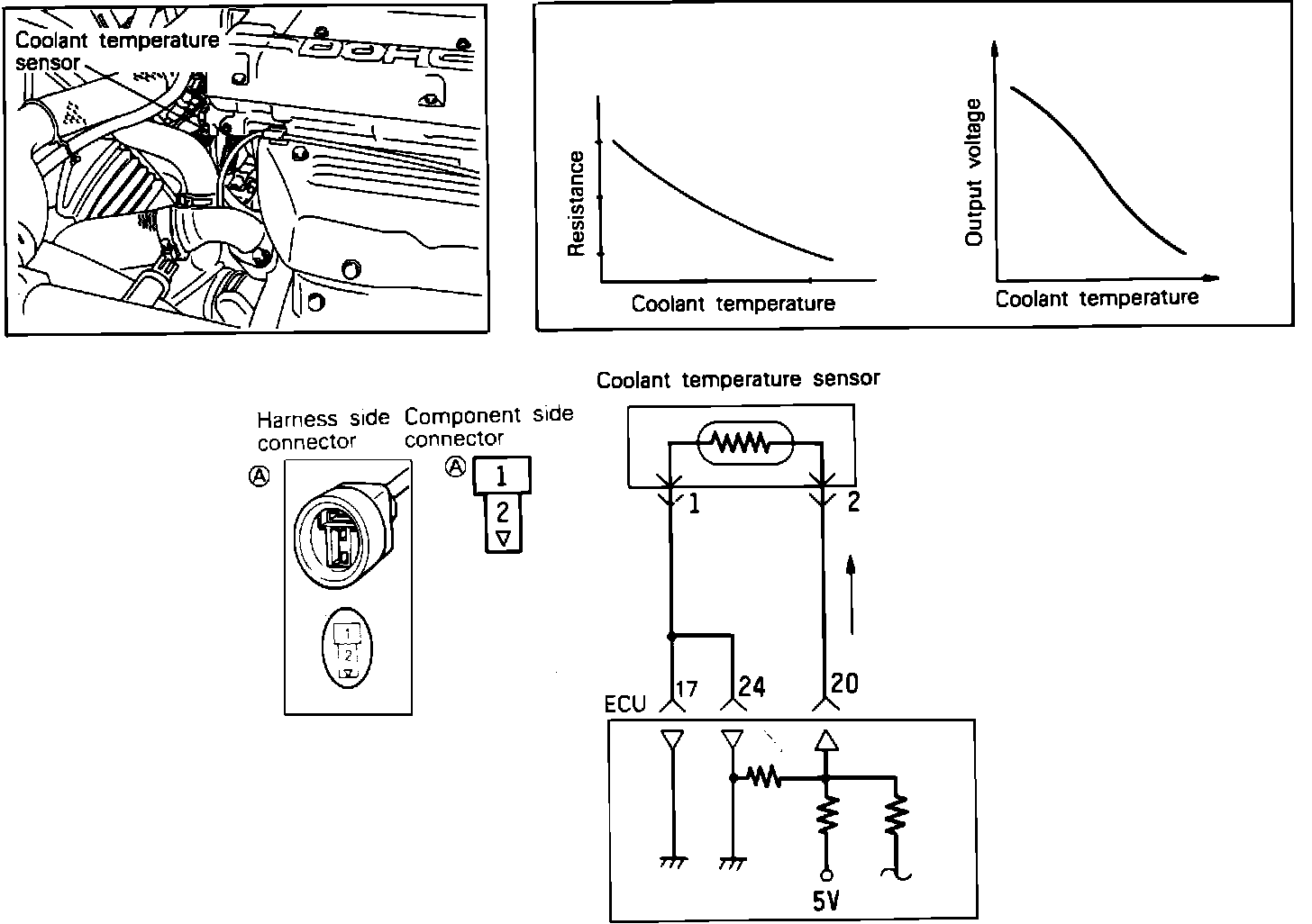 The Coolant Temperature Sensor, located in the thermostat housing, is a thermistor type sensor. As engine temperature increases, sensor resistance decreases. The ECU judges engine temperature by the sensor output Voltage and provides optimum fuel enrichment when the engine is cold.