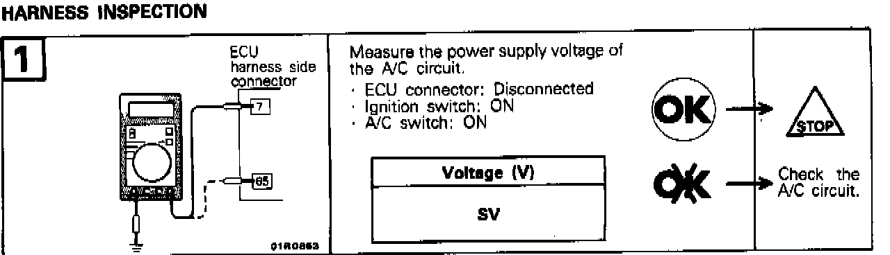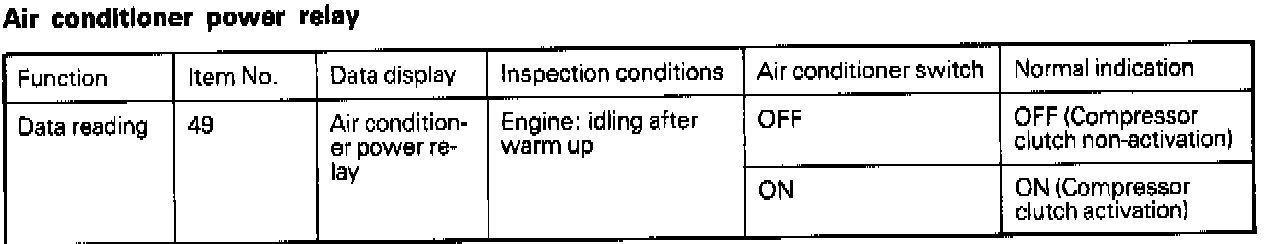 When idling speed does not increase for the air conditioner or when the air conditioner compressor does not run, a short-circuit or broken wire may occur in the circuit related to the air conditioner.
