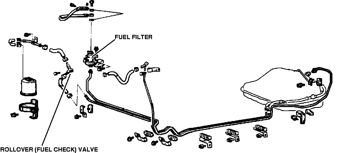 The overfill limiter is mounted in-line, in the vapor line, on the LH side of the fuel tank.