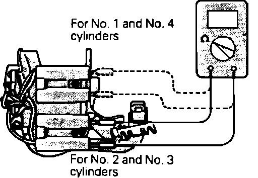 4. Using an ohm meter, check the resistance between secondary terminals for cylinders No. 1 and No. 4.
