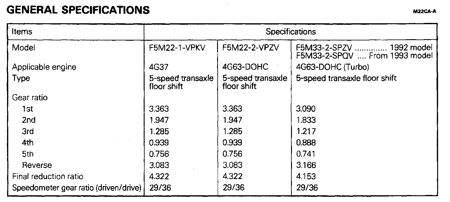 F5M22/F5M33 M/T, Gear Ratios (New Inclusion From '93):