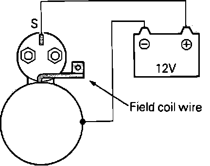 2. Connect a 12 volt battery between ``S'' terminal and body ground. This test must be performed in less than 10 seconds to prevent coil from burning out.