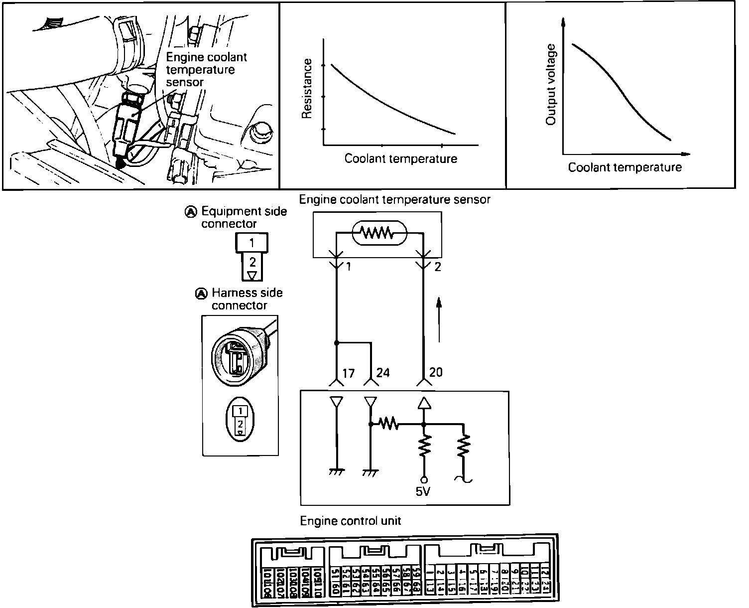 The Coolant Temperature Sensor, located in the thermostat housing, is a thermistor type sensor. As engine temperature increases, sensor resistance decreases. The ECU judges engine temperature by the sensor output voltage and provides optimum fuel enrichment when the engine is cold.